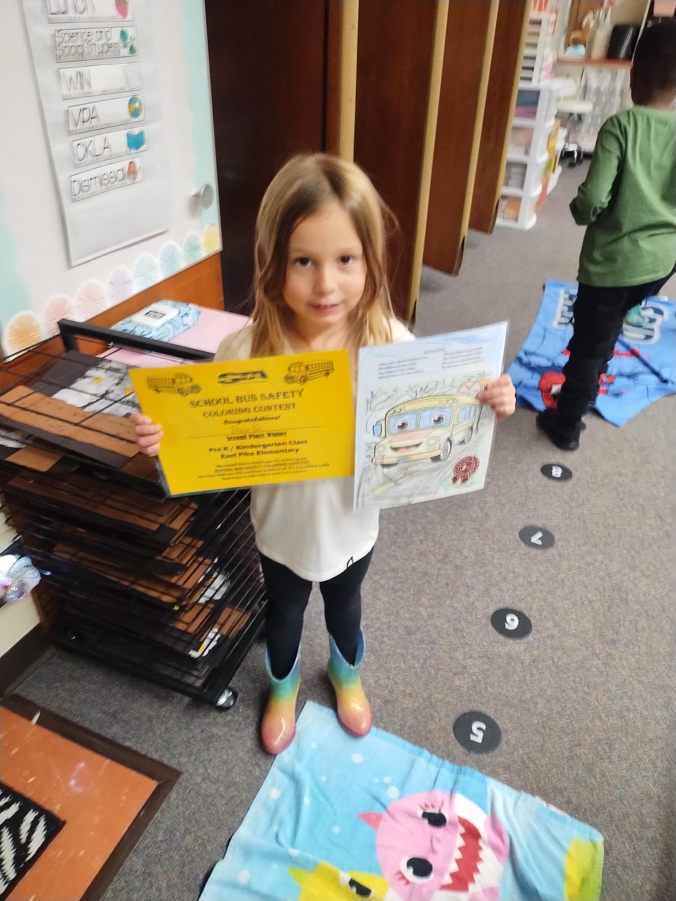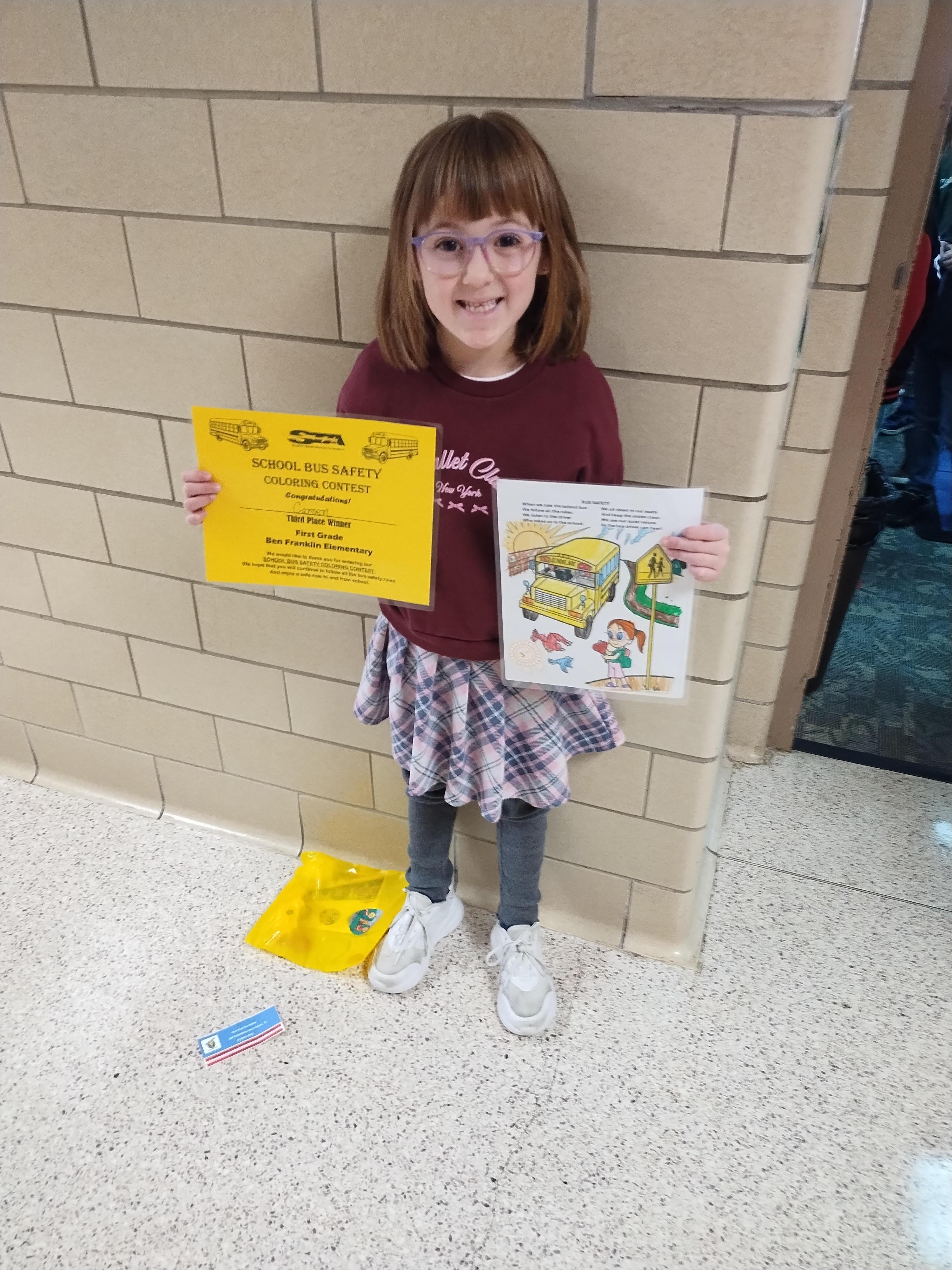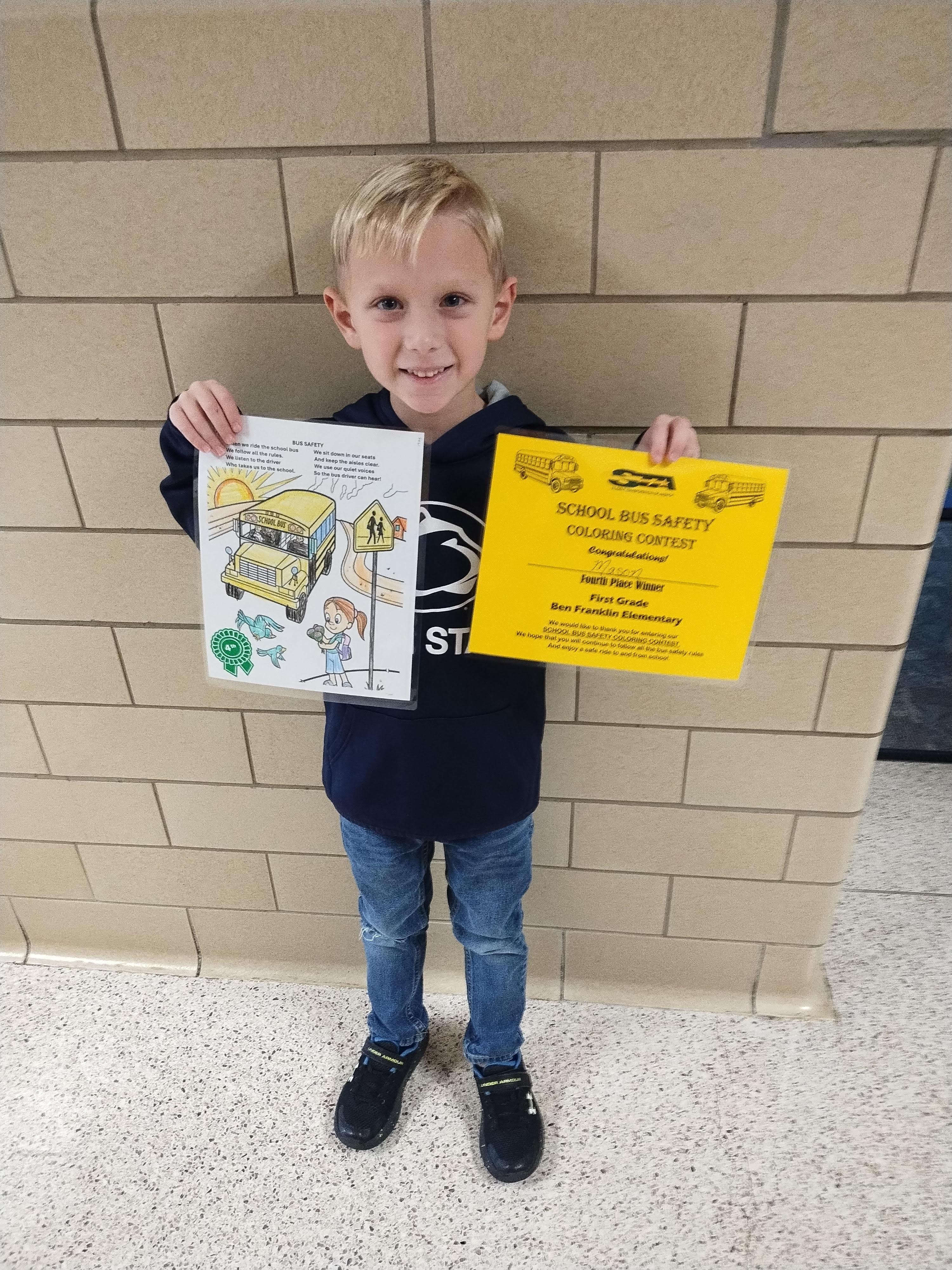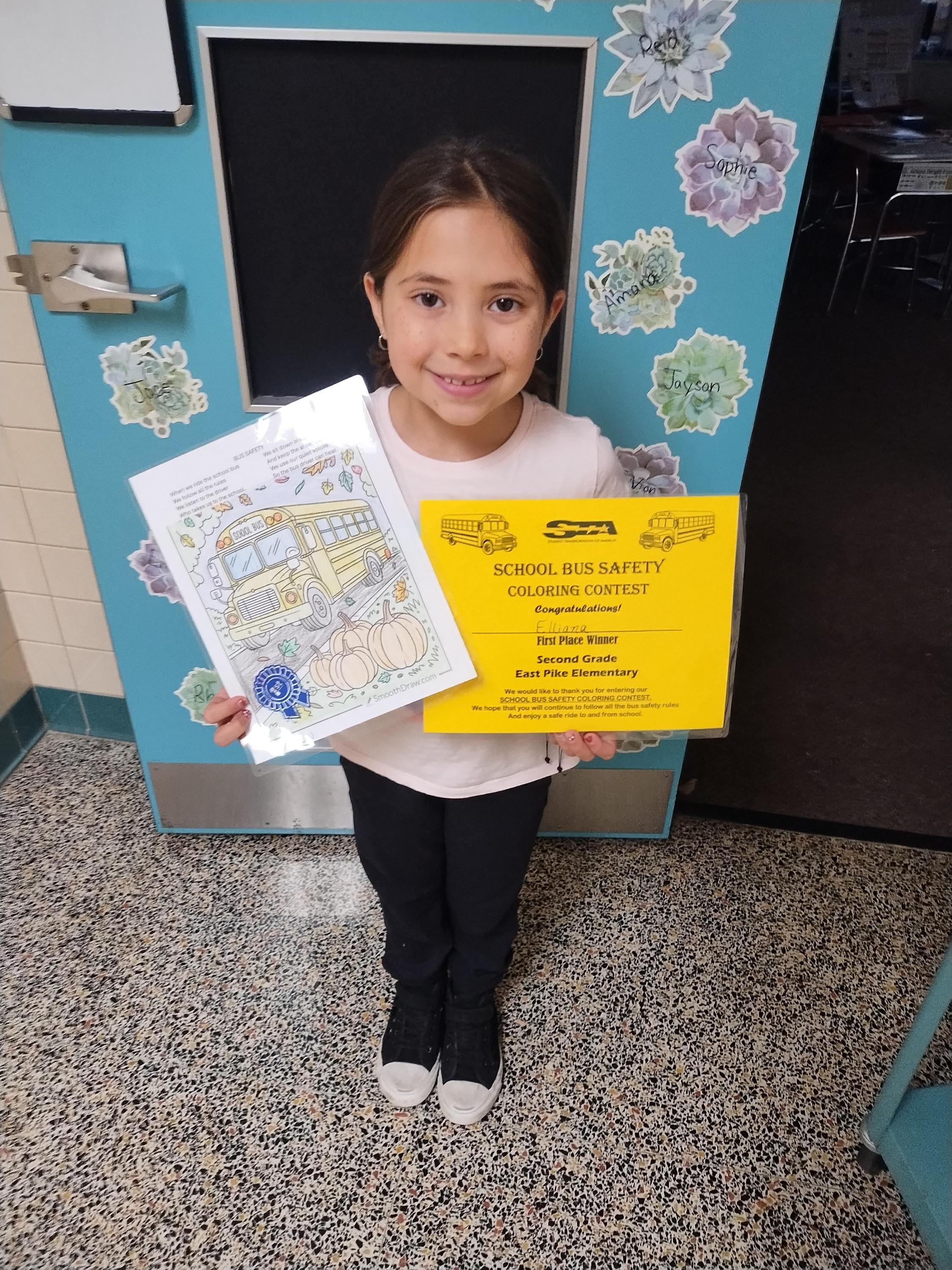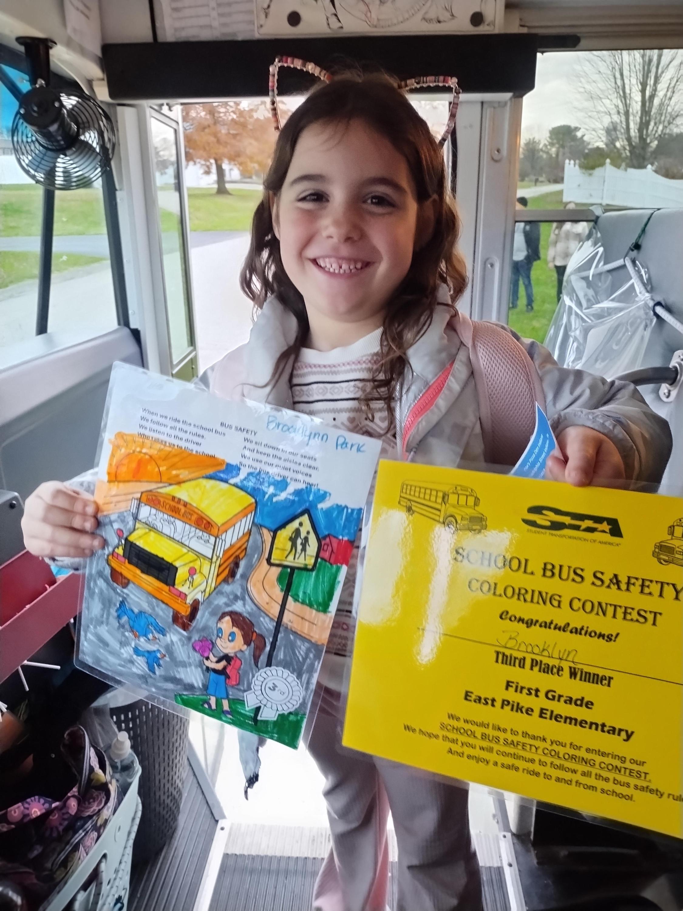 Pre-K through 3rd grade students at East Pike and Ben Franklin participated in the coloring contest. Each grade had four winners for a total of 32 winners from both schools, with each receiving a certificate, school bus safety materials, and a free pizza from Fox’s Pizza Den!